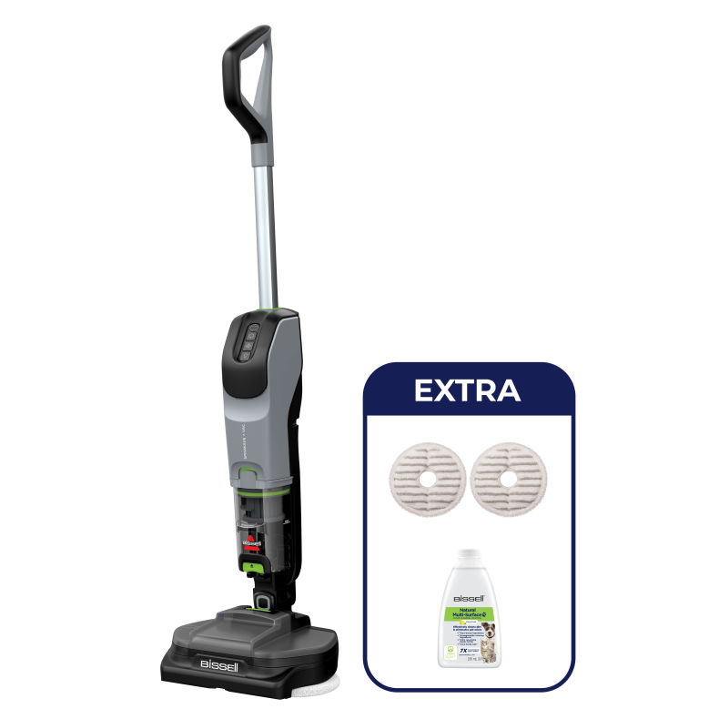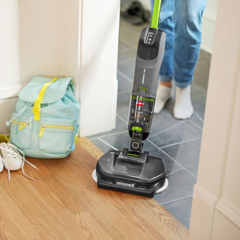 O aparelho de limpeza para pavimentos duros BISSELL® SpinWave® + Vac Pet Select sem fios oferece uma experiência de limpeza sem pó, aspirando os detritos secos dos pavimentos duros com uma potente aspiração ciclónica enquanto passa a mopa.